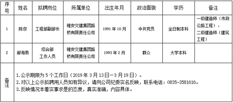 米兰体育-米兰(中国)官网 子公司拟聘用人员公示(路桥公司)