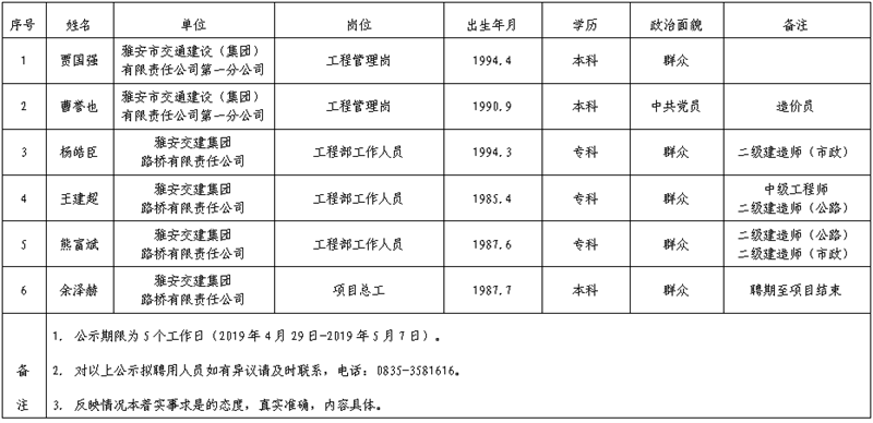 米兰体育-米兰(中国)官网 子公司拟聘用人员公示(路桥公司、第一分公司)