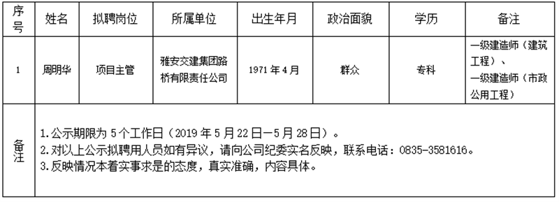 米兰体育-米兰(中国)官网 子公司拟聘用人员公示(路桥公司)