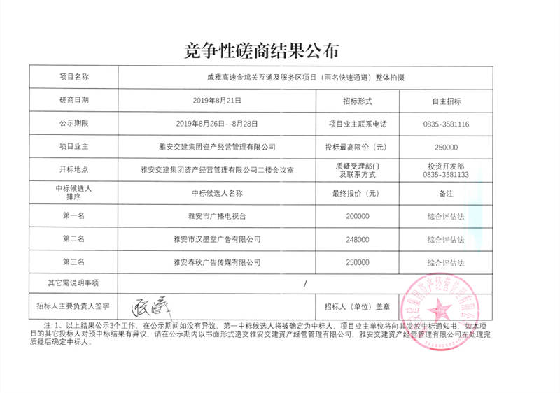 成雅高速金鸡关互通及服务区项目(雨名快速通道)整体拍摄竞争性磋商结果公布