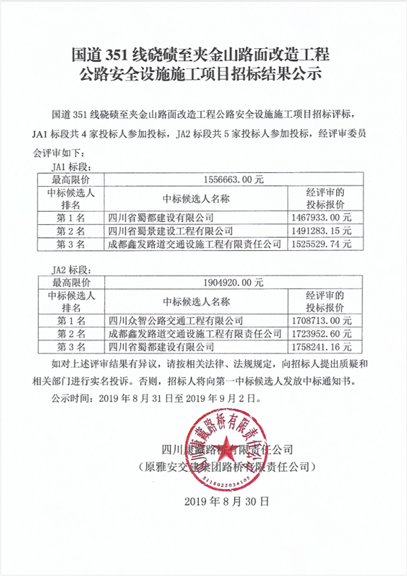 国道351线硗碛至夹金山路面改造工程公路安全设施施工项目招标结果公示