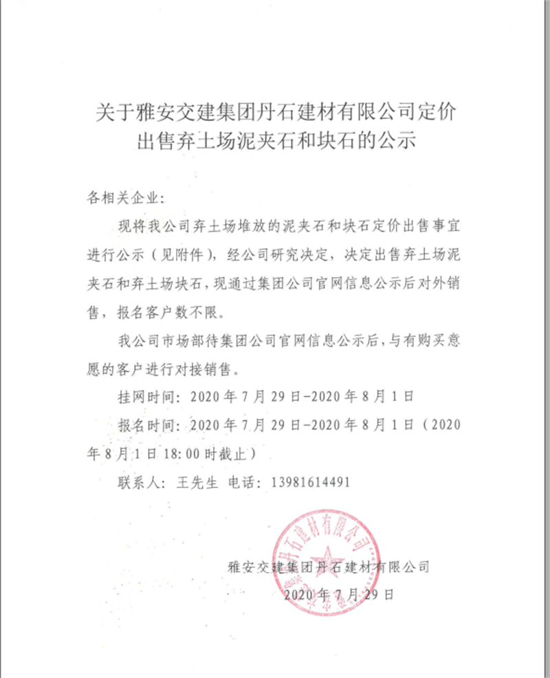 关于米兰体育-米兰(中国)官网 丹石建材有限公司定价出售弃土场泥夹石和块石的公示