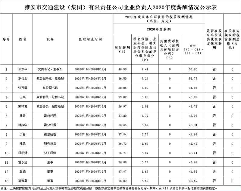 2020年交建集团企业负责人薪酬情况公示