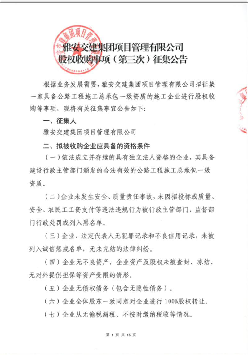 米兰体育-米兰(中国)官网 项目管理有限公司股权收购事项(第三次)征集公告