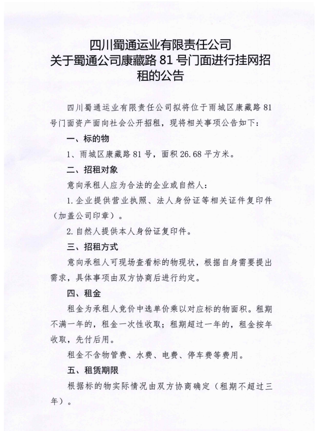 四川蜀通运业有限责任公司关于蜀通公司康藏路81号门面进行挂网招租的公告:附件