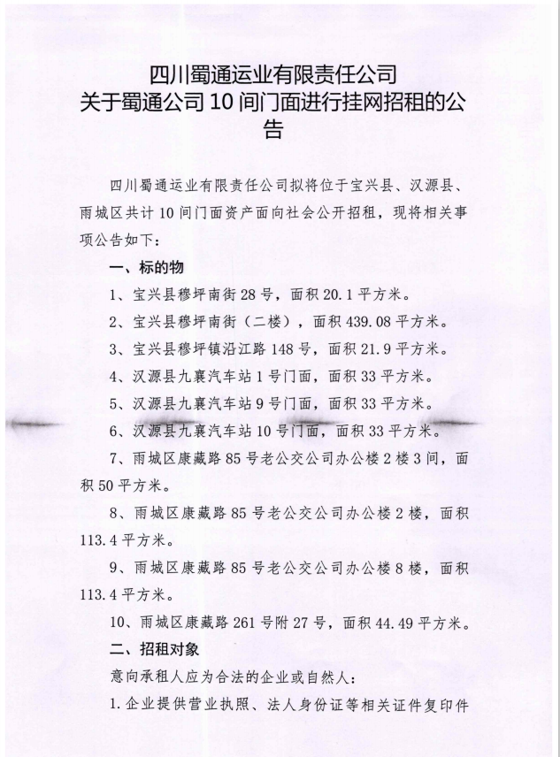 关于蜀通公司10间门面进行挂网招租的公告