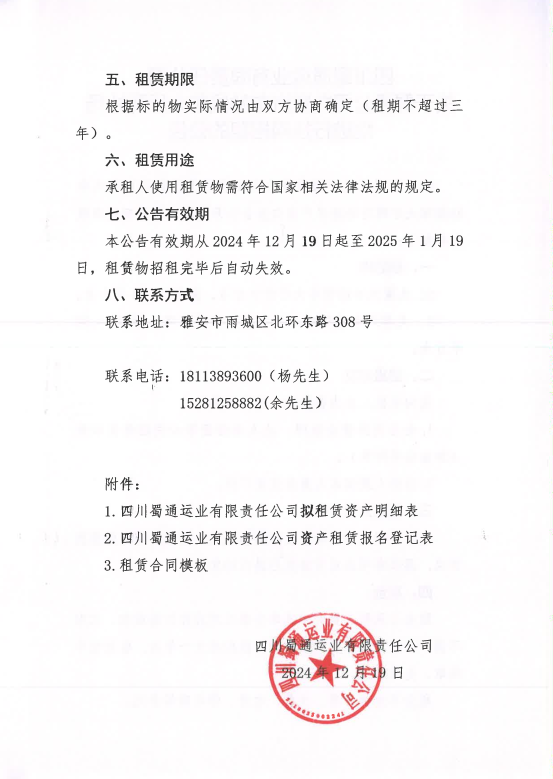 四川蜀通运业有限责任公司关于蜀通公司九襄汽车站候车大厅两处场地进行挂网招租的公告