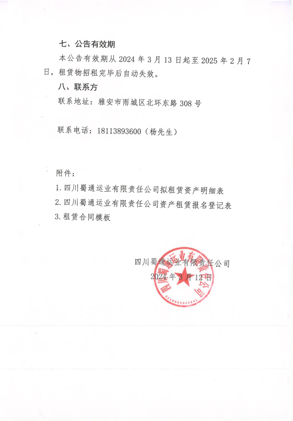 四川蜀通运业有限责任公司关于对外租赁部分门面、办公室资产的公告附件