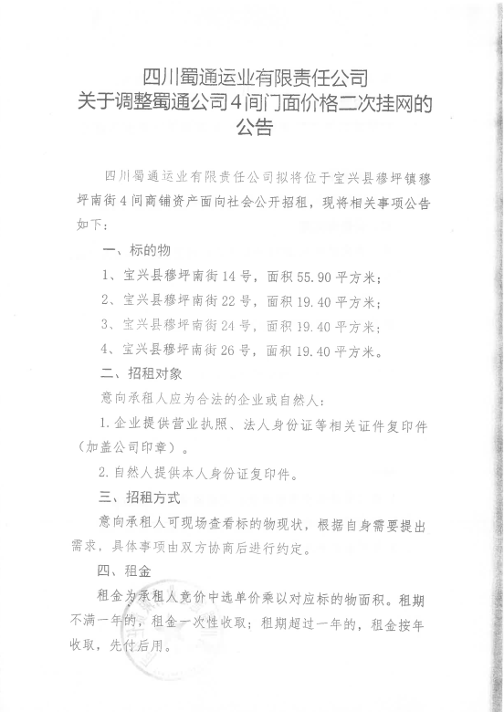 四川蜀通运业有限责任公司关于调整蜀通公司4间门面价格二次挂网的公告