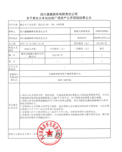 四川康藏路桥有限责任公司关于雅安火车站站前广场资产公开招租结果公示