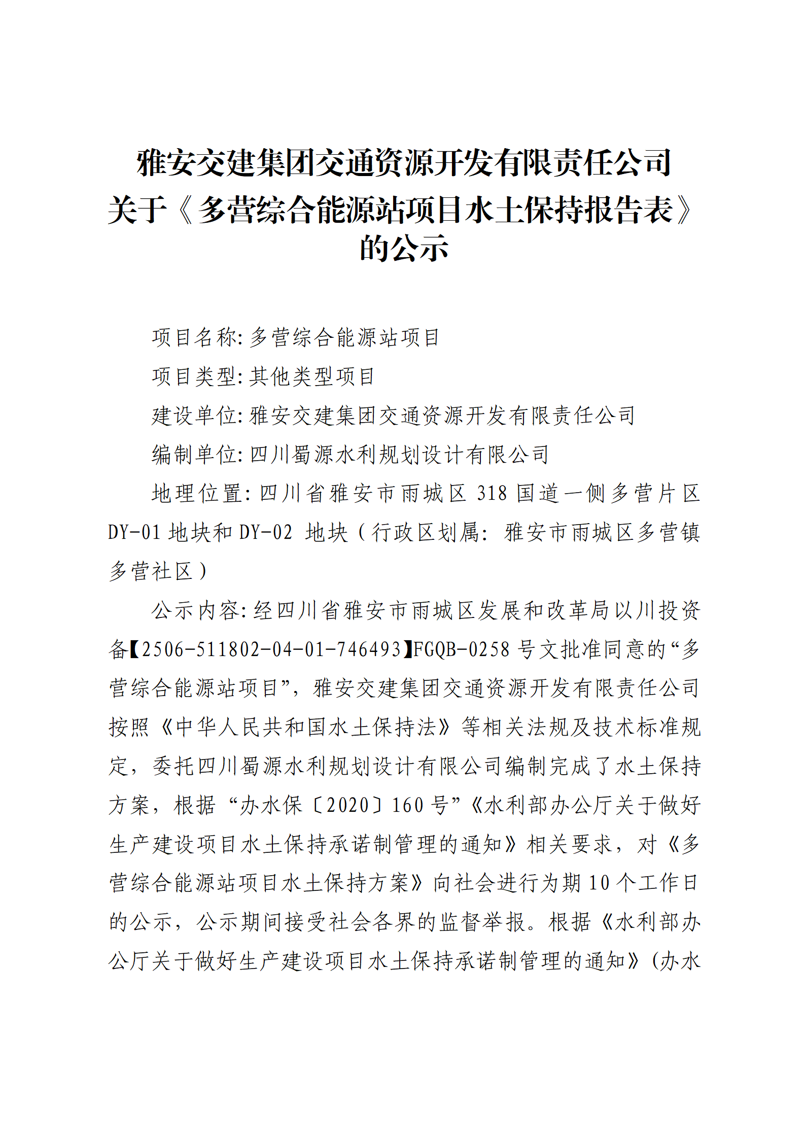 米兰体育-米兰(中国)官网 交通资源开发有限责任公司 关于《多营综合能源站项目水土保持报告表》的公示