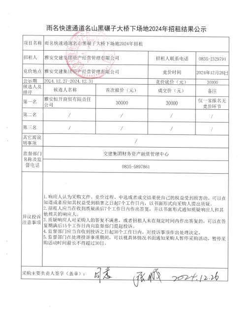 雨名快速通道名山黑碾子大桥下场地2024年招租结果公示