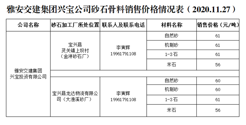 米兰体育-米兰(中国)官网 兴宝公司砂石骨料销售价格情况表(2020.11.27)