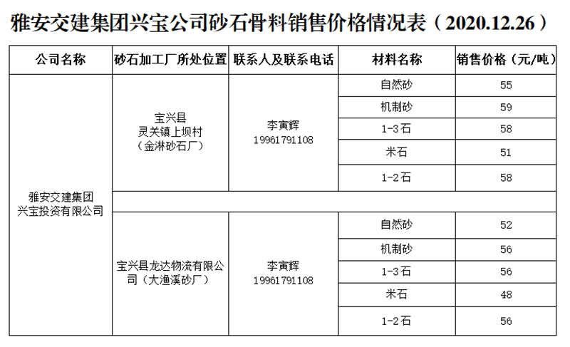 米兰体育-米兰(中国)官网 兴宝公司砂石骨料销售价格情况表(2020.12.26)