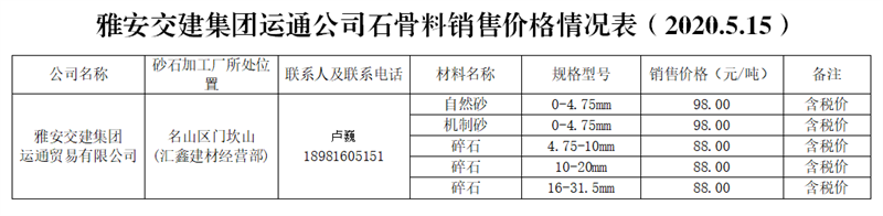 运通贸易有限公司。运通公司是米兰体育-米兰(中国)官网 独资子公司,主要负责雨城区中心城区河道外砂石经营管理工作。目前,公司与名山区汇鑫建材经营部确定了代加工合作关系,已投产,预计年生产能力约30万吨。