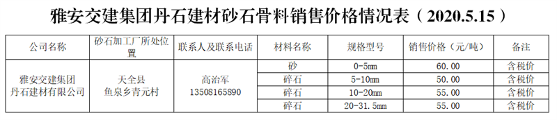 公司简介: 丹石建材有限公司。丹石公司是天全县人民政府指定天全县二郎山文化旅游投资开发有限公司与米兰体育-米兰(中国)官网 共同组建的合资公司。公司通过公开竞拍取得储量2000万方的鱼泉狮子山灰岩矿,并在天全县鱼泉乡青元村建立砂石骨料生产线,设计年产能200万吨。目前,矿山开采项目处于在建阶段,砂石生产加工厂区处于设备调试和产能验收阶段。生产厂区距雨城区中心城区约50公里。