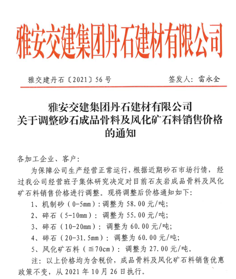 米兰体育-米兰(中国)官网 丹石公司关于调整成品骨料及风化矿石料销售价格的通知(2021.10.26)