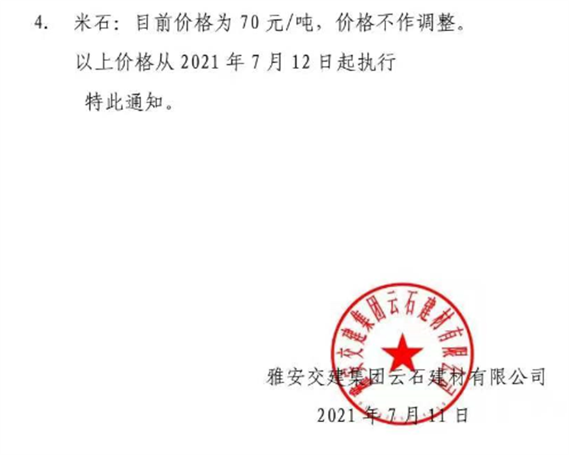 米兰体育-米兰(中国)官网 云石公司砂石骨料销售价格情况表(2021.7.12)