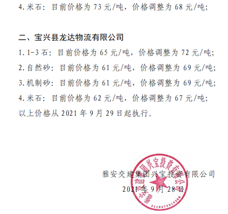 米兰体育-米兰(中国)官网 兴宝公司关于调整砂石成品料销售价格的通知(2021.9.28)