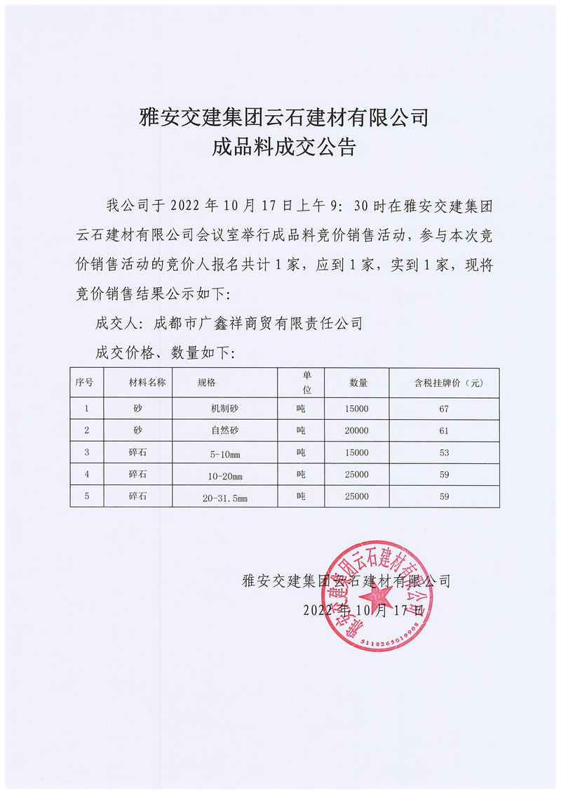 米兰体育-米兰(中国)官网 云石建材有限公司成品料成交公告10.17