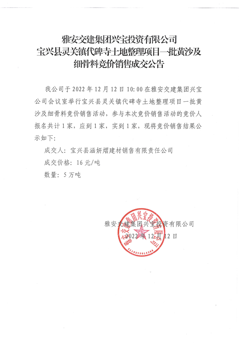 米兰体育-米兰(中国)官网 兴宝投资有限公司宝兴县灵关镇代碑寺土地整理项目5万吨黄沙及细骨料竞价销售成交公告(2022-12-12)