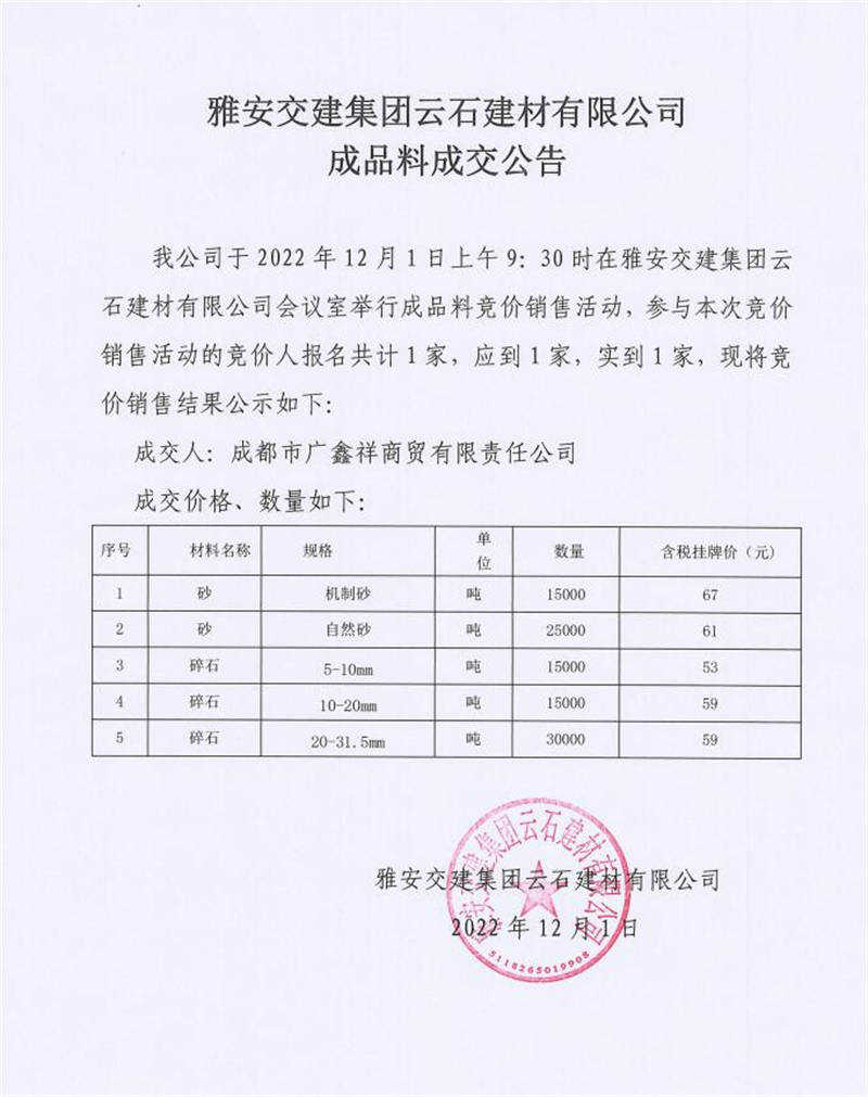米兰体育-米兰(中国)官网 云石建材有限公司成品料竞价销售成交公告(2022-12-01)