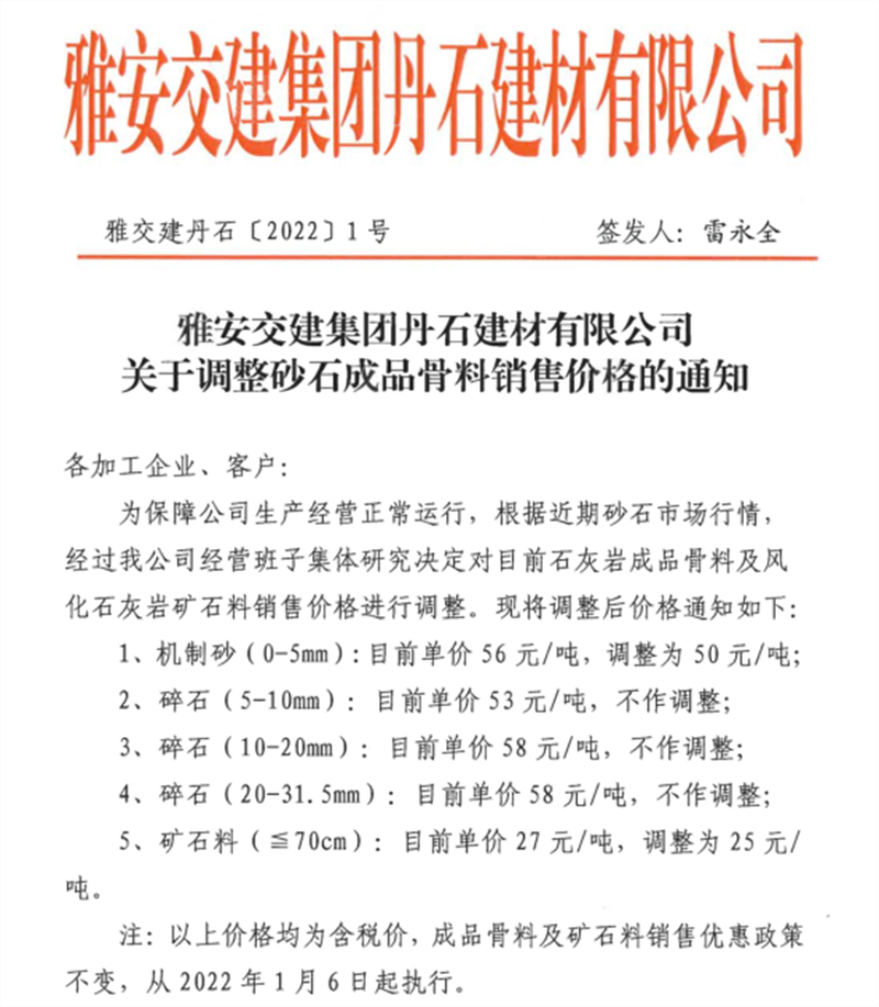 米兰体育-米兰(中国)官网 丹石公司关于调整砂石成品骨料销售价格的通知(2022.1.5)