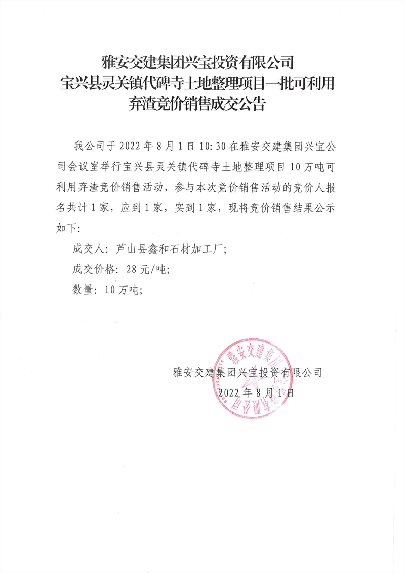 米兰体育-米兰(中国)官网 兴宝投资有限公司灵关镇代碑寺土地整理项目5万吨可利用弃渣竞价销售成交公告(2022.8.1)