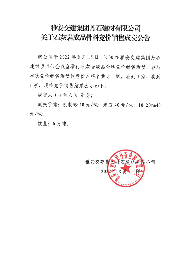 米兰体育-米兰(中国)官网 丹石建材有限公司关于石灰岩成品骨料竞价销售成交公告
