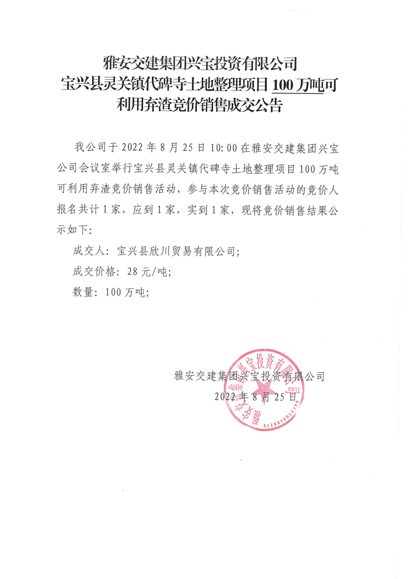 米兰体育-米兰(中国)官网 兴宝投资有限公司宝兴县灵关镇代碑寺土地整理项目5万吨可利用弃渣竞价销售成交公告(8.23)