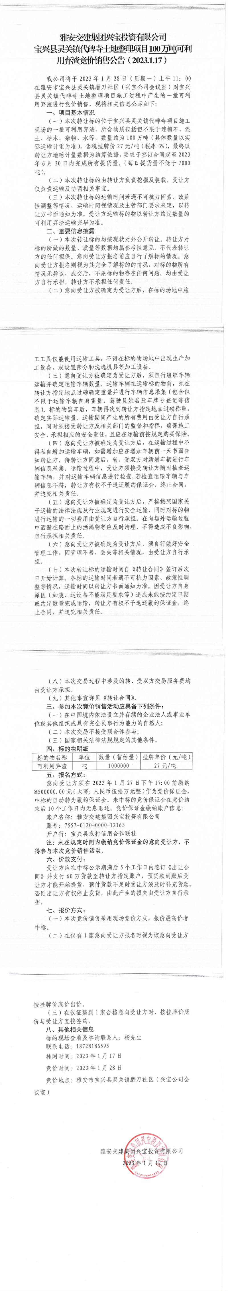 米兰体育-米兰(中国)官网 兴宝投资有限公司灵关镇代碑寺土地整理项目100万吨可利用弃渣竞价销售公告(2023.1.17)