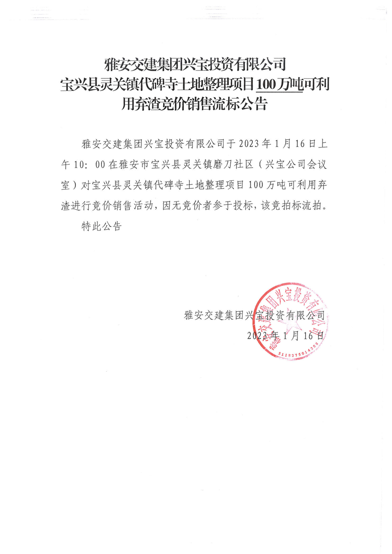 米兰体育-米兰(中国)官网 兴宝投资有限公司100万吨可利用弃渣竞价销售流标公告(2023.1.16)