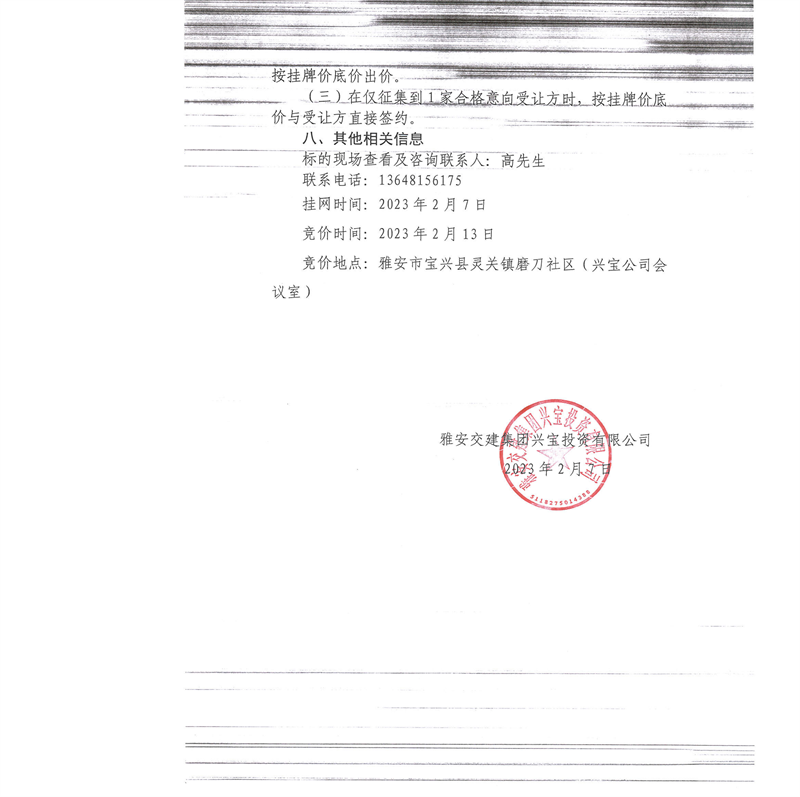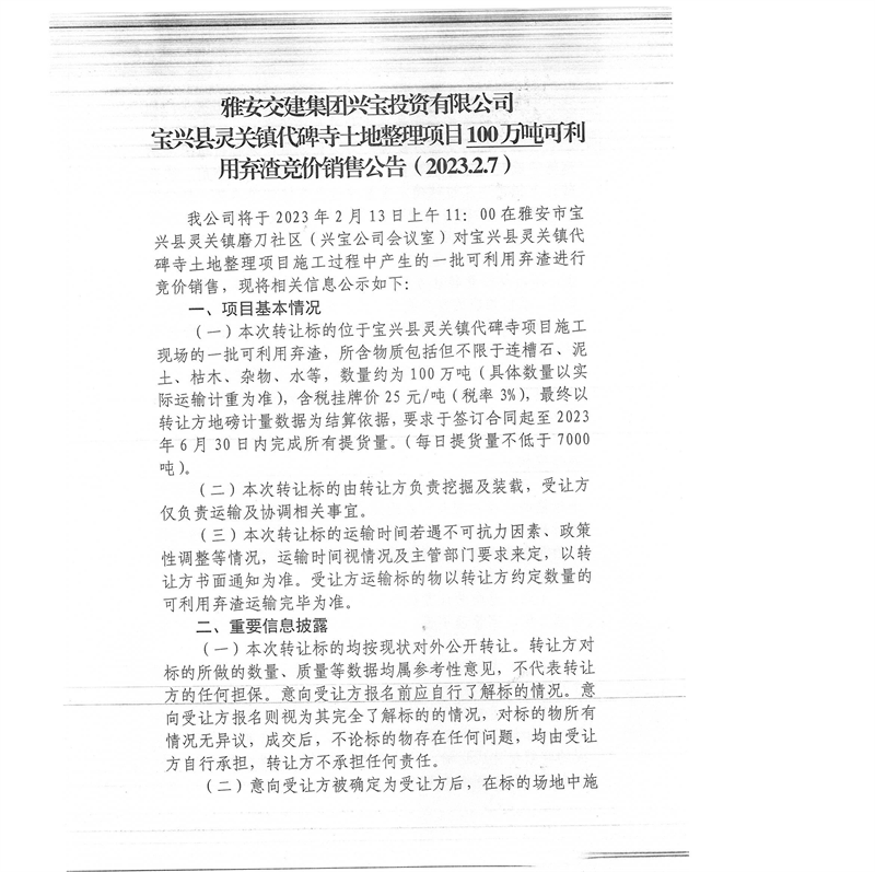 米兰体育-米兰(中国)官网 兴宝投资有限公司灵关镇代碑寺土地整理项目100万吨可利用弃渣竞价销售公告(2023.2.7)