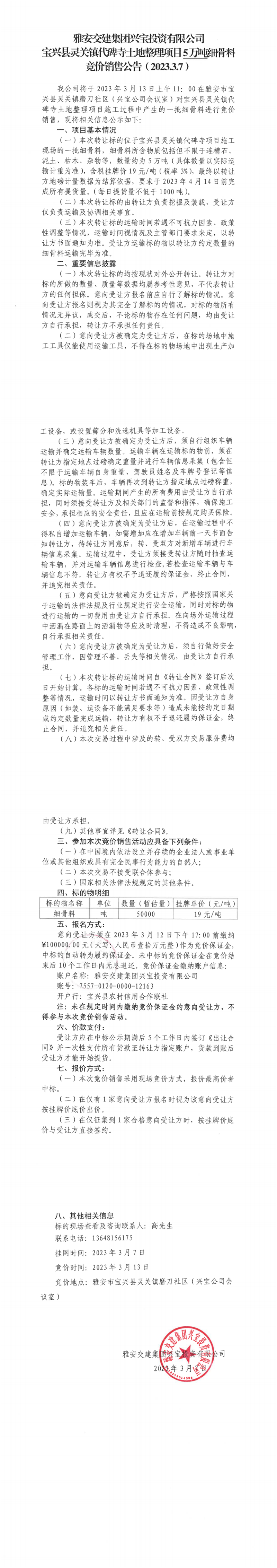 米兰体育-米兰(中国)官网 兴宝投资有限公司宝兴县灵关镇代碑寺土地整理项目5万吨细骨料竞价销售公告(2023.3.7)