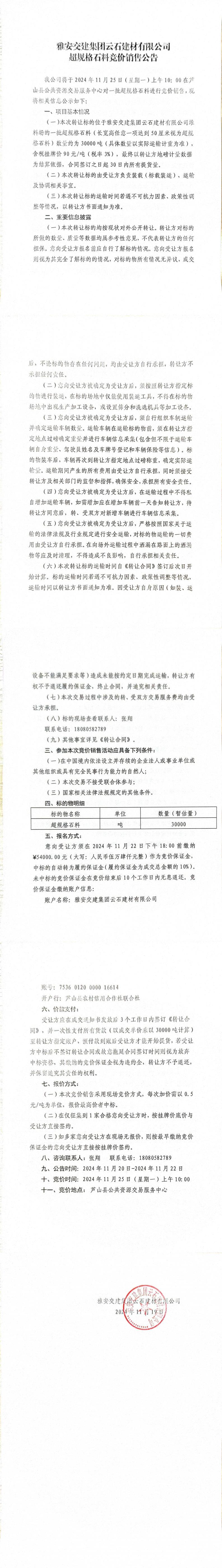 米兰体育-米兰(中国)官网 云石建材有限公司超规格石料竞价销售公告(2024-11-19)