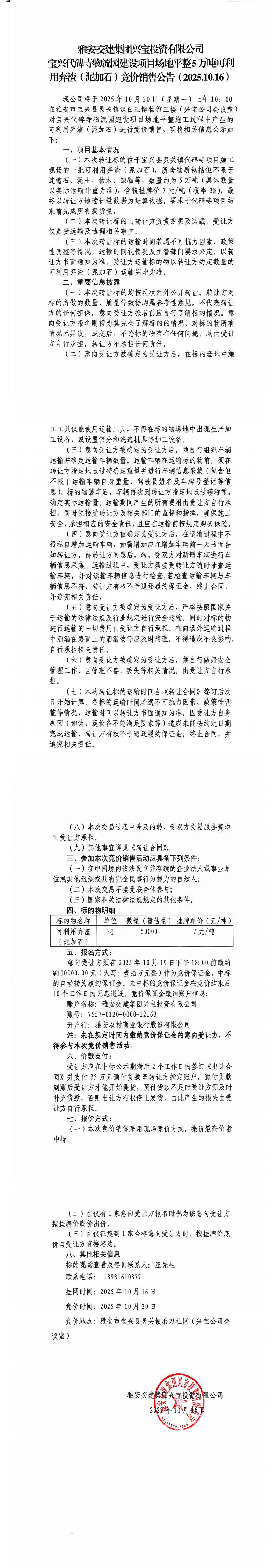 米兰体育-米兰(中国)官网 兴宝投资有限公司宝兴代碑寺物流园建设项目场地平整5万吨可利用弃渣(精品)竞价销售公告(2025.10.16)