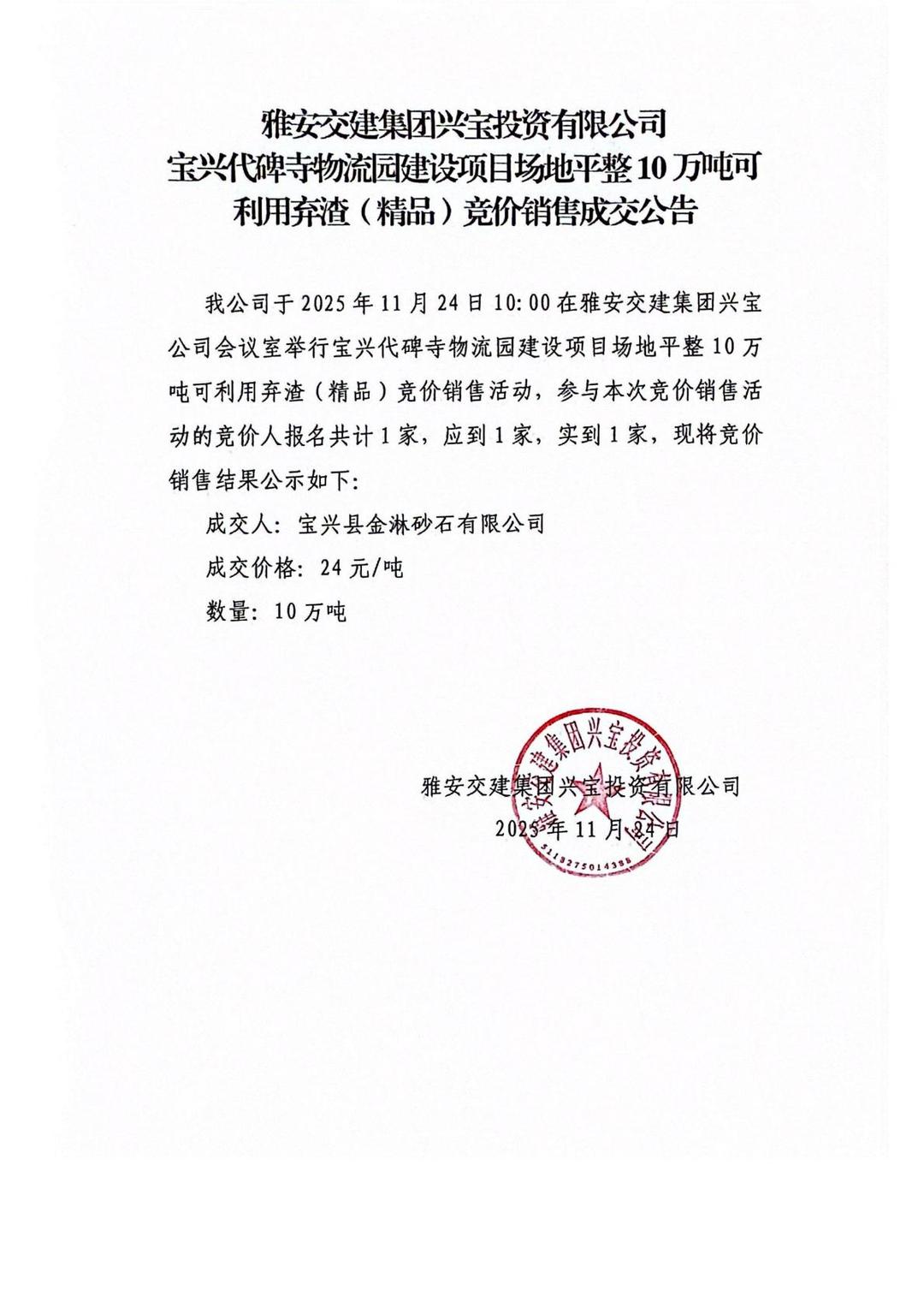 米兰体育-米兰(中国)官网 兴宝投资有限公司10万吨可利用弃渣(精品)竞价销售成交公告(2025.11.24)