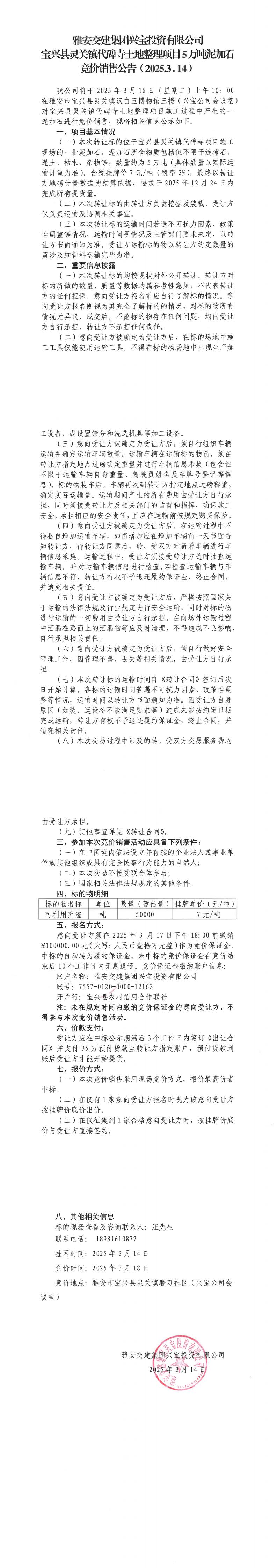 米兰体育-米兰(中国)官网 兴宝投资有限公司宝兴县灵关镇代碑寺土地整理项目5万吨泥加石竞价销售公告(2025.03.14)