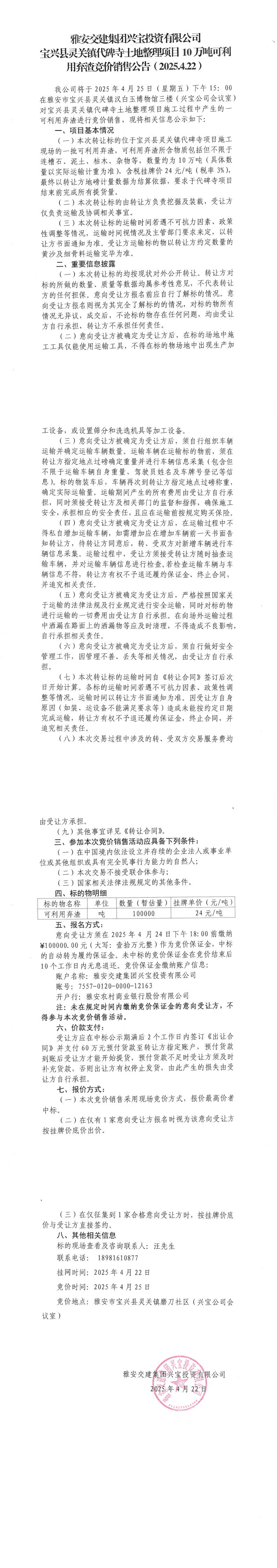米兰体育-米兰(中国)官网 兴宝投资有限公司宝兴县灵关镇代碑寺土地整理项目10万吨可利用弃渣竞价销售公告