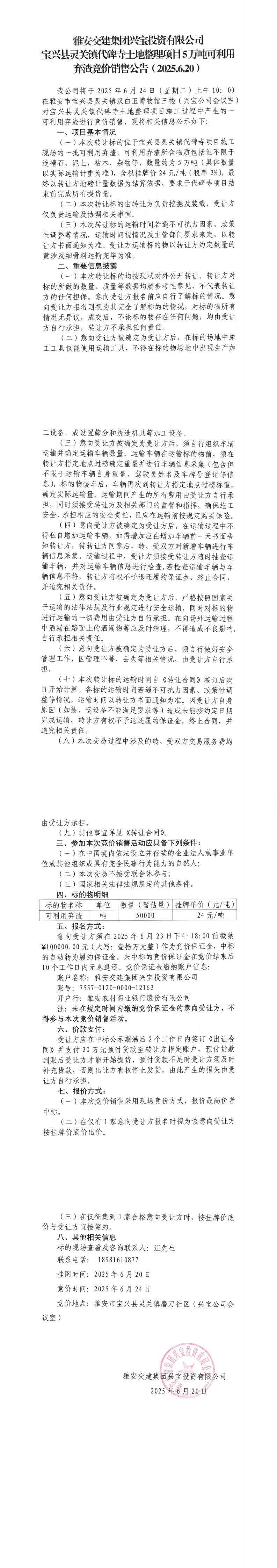 米兰体育-米兰(中国)官网 兴宝投资有限公司宝兴县灵关镇代碑寺土地整理项目5万吨可利用弃渣竞价销售公告