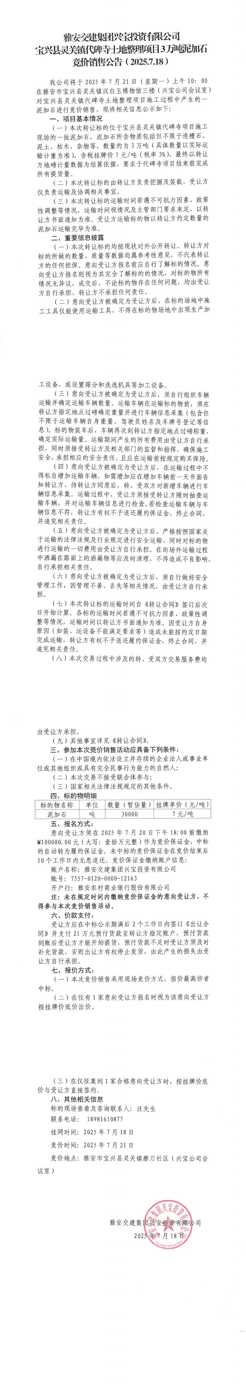 米兰体育-米兰(中国)官网 兴宝投资有限公司宝兴县灵关镇代碑寺土地整理项目5万吨可利用弃渣竞价销售公告